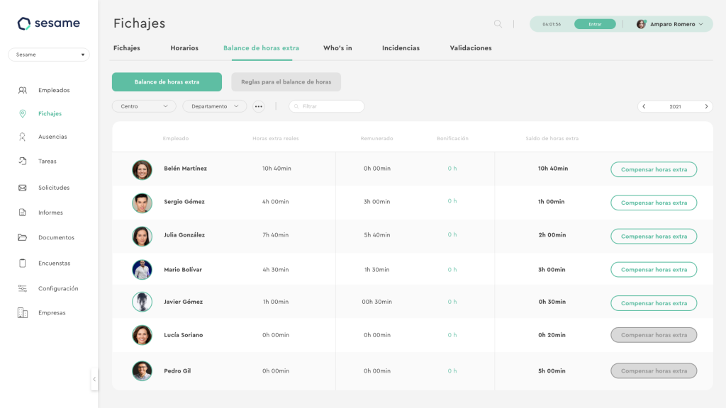 Consultar la bolsa de horas de trabajo de tus empleados con Sesame HR es muy fácil. Para ello, tendrás que acceder a la pestaña «Fichajes» del menú vertical izquierdo en el panel de administrador. Y seleccionar la opción «Balance de horas extras» en el menú horizontal.