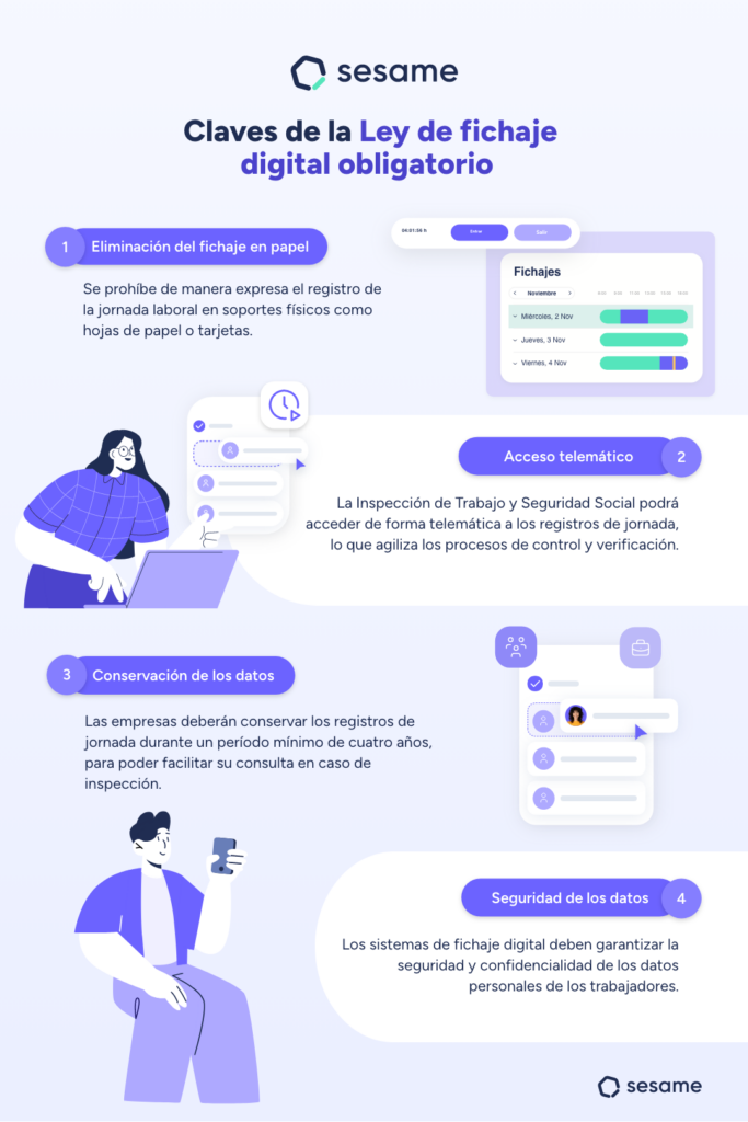 La ley exige que las empresas registren la hora de inicio y fin de la jornada laboral de cada empleado, conserven estos registros durante al menos cuatro años, y los pongan a disposición de los empleados, sus representantes y la Inspección de Trabajo cuando sea requerido.