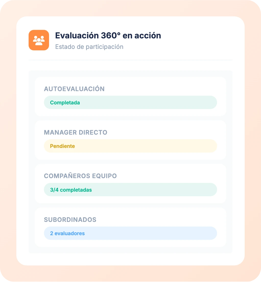 Sesame ofrece diversas metodologías adaptadas a las necesidades de cada organización: - Evaluación 90°: Realizada exclusivamente por el supervisor directo del empleado. - Evaluación 180°: Incluye la autoevaluación del empleado y la evaluación de su supervisor inmediato. - Evaluación 360°: Incorpora retroalimentación de múltiples fuentes, como compañeros, subordinados, supervisores y, en algunos casos, clientes, proporcionando una visión integral del desempeño del empleado.