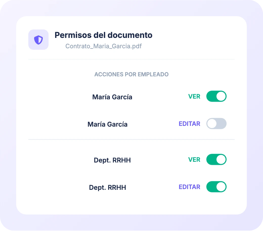 el usuario final trabaja con dos acciones claras — Ver y Editar — aplicadas por sección, carpeta o documento individual. El administrador decide quién puede ver un documento (sin tocarlo) y quién puede editarlo. Así de sencillo para el empleado, así de potente para RRHH