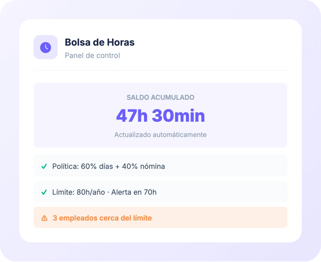 Compensación flexible: Define reglas globales o por empleado — días libres, dinero en nómina o modelo híbrido. Configura límites de acumulación anuales y el sistema los aplica sin que tengas que recordarlo.